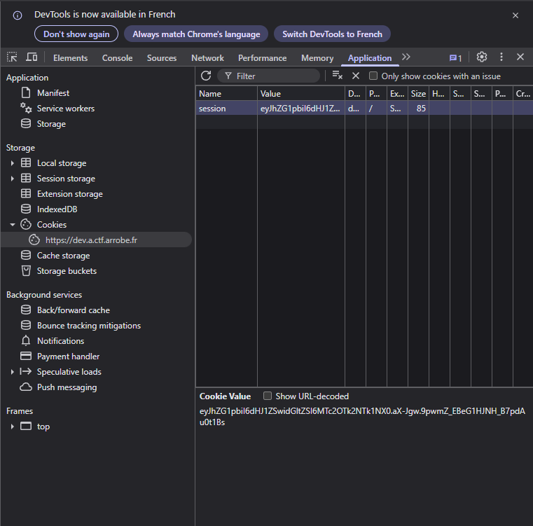 Dans le navigateur, F12 > Application > Cookies > https://dev.a.ctf.arrobe.fr